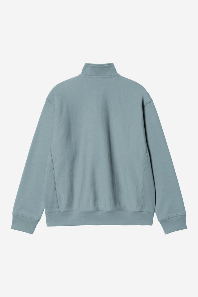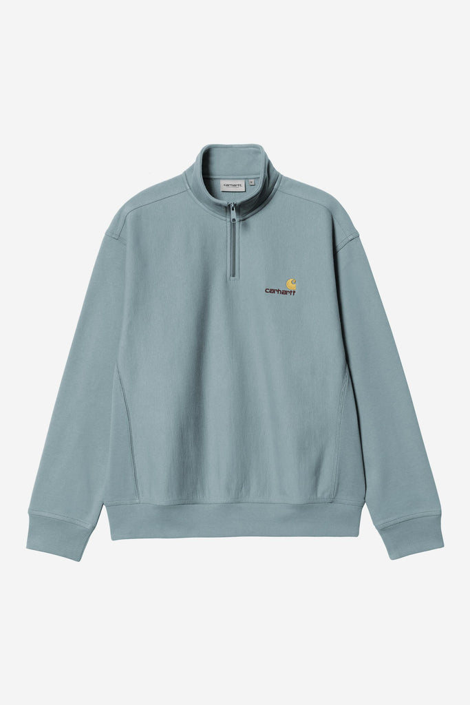 The Carhartt WIP Half Zip American Script Sweatshirt is constructed from a 12.3 oz cotton-polyester blend and brushed for extra softness and warmth, without losing breathability. The garment features a highneck with a zipper and a small logo. Appears in a loose, boxy silhouette.