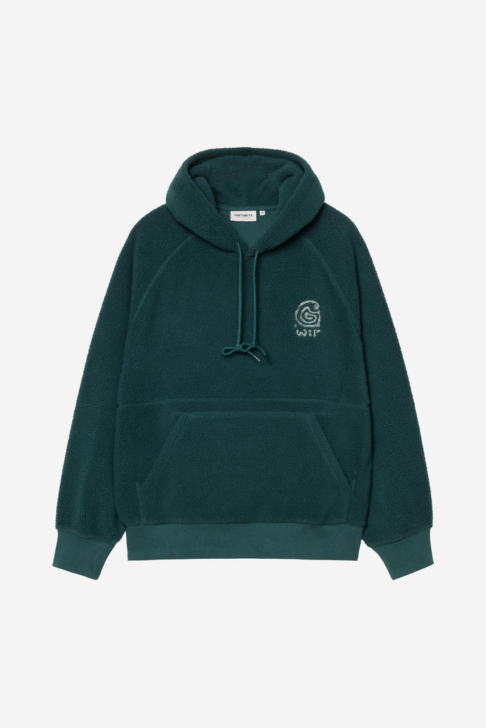 The Carhartt WIP Hooded Helix Sweatshirt is made from midweight, brushed polyester fleece. It is cut in a balloon fit, which is a little looser and boxier, but also characterized by dropped shoulders and ribbed trims. The style features an adjustable hood as well as a kangaroo pocket. Graphic embroidery appears on the front and back.