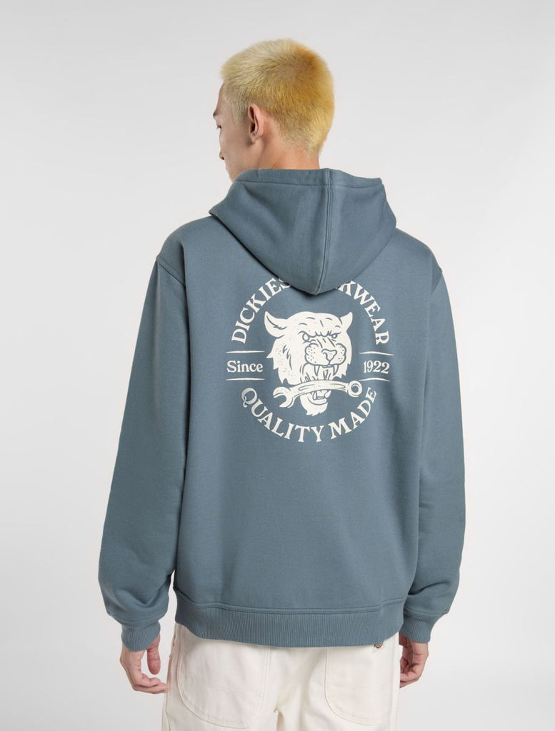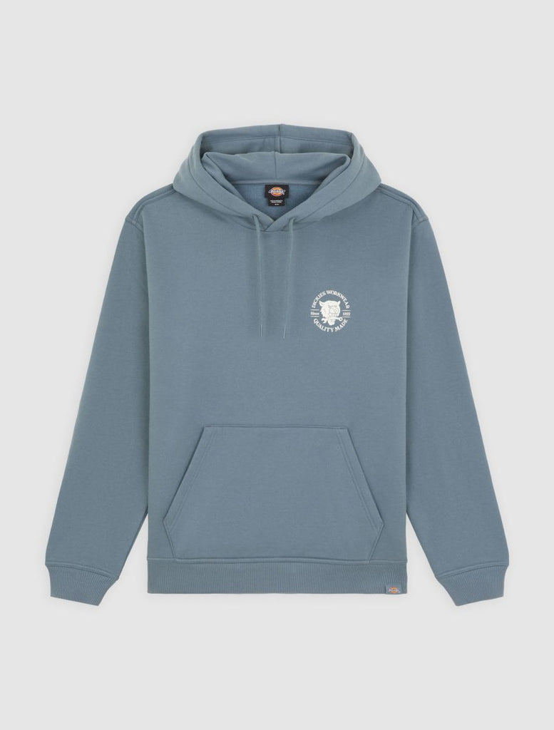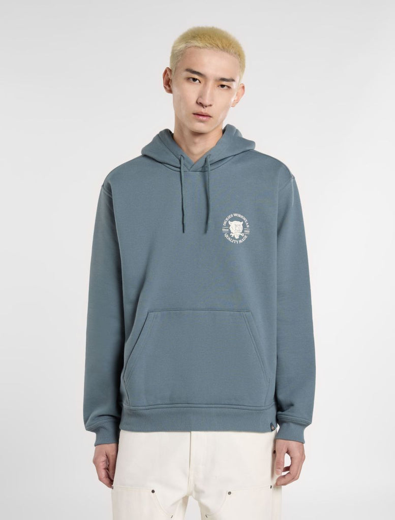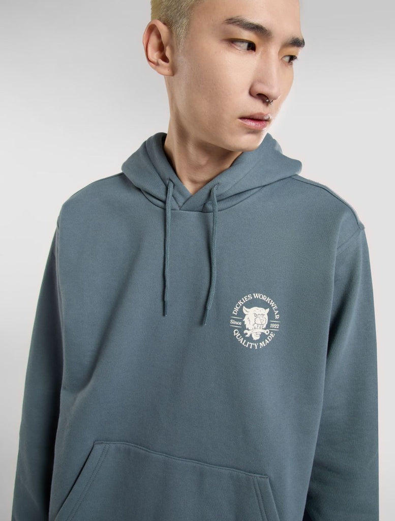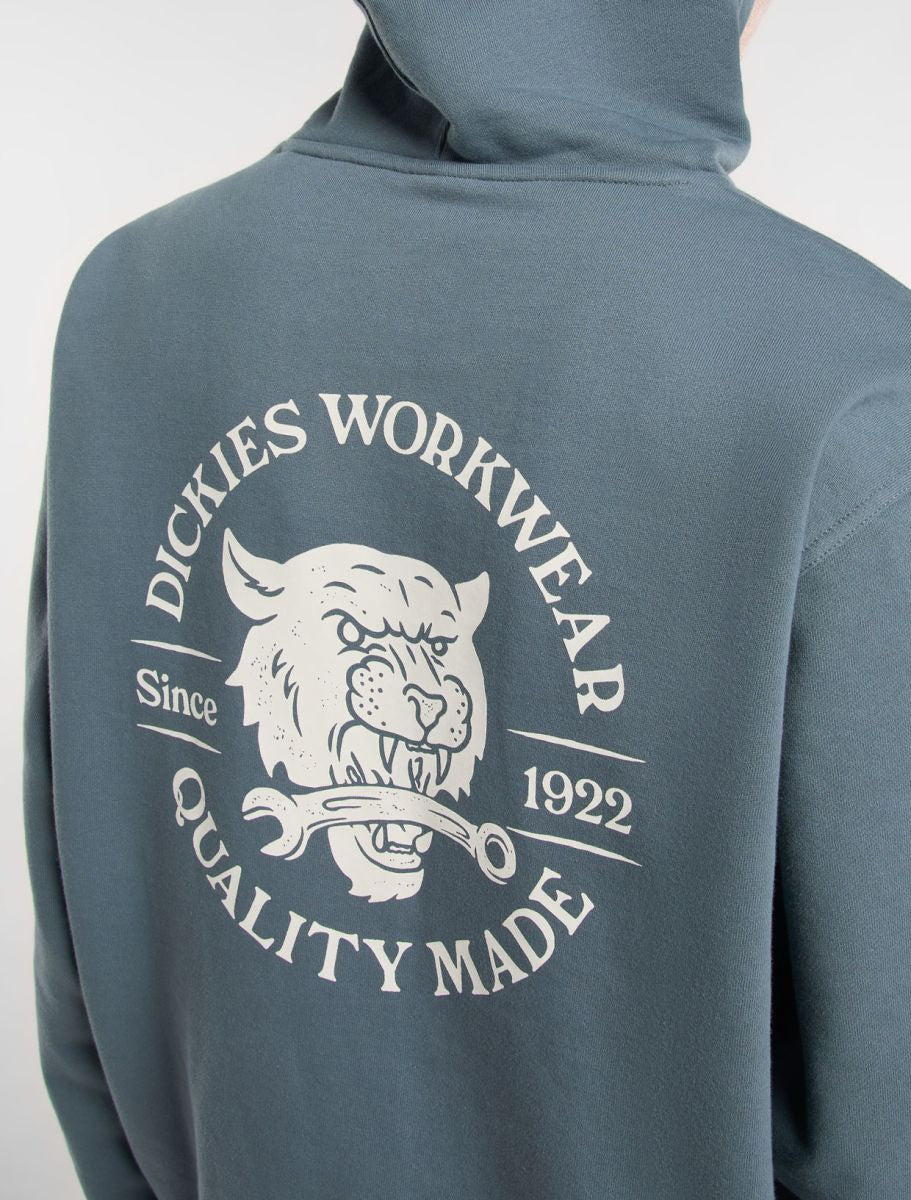 The Dickies Wrench Hoodie is a relaxed and comfortable hooded sweater for cooler days and evenings. Made from durable poly-cotton brushed-back fleece, this durable hoodie is finished with a drawstring hood, front pouch pocket and a circular vintage-style workshop illustration inspired by our workwear roots on the left chest and back.