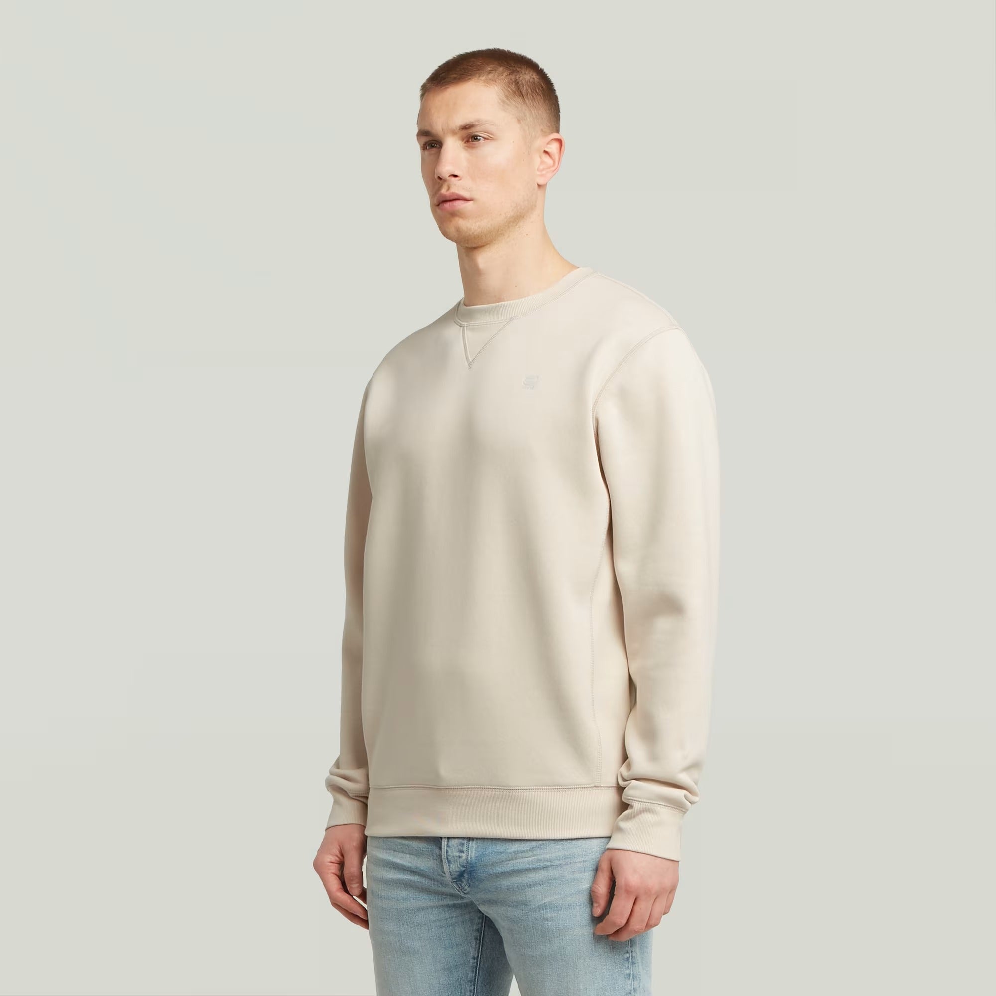 The Premium Core sweater is executed in a straight fit with a rounded neckline and a triangle inset piece. Also the side panels, cuffs and waist are executed in a ribbed knit. The long sleeves are cut rounded at the wrist, showing a higher cuff. A subtle branding is added to the chest and at the side seam.