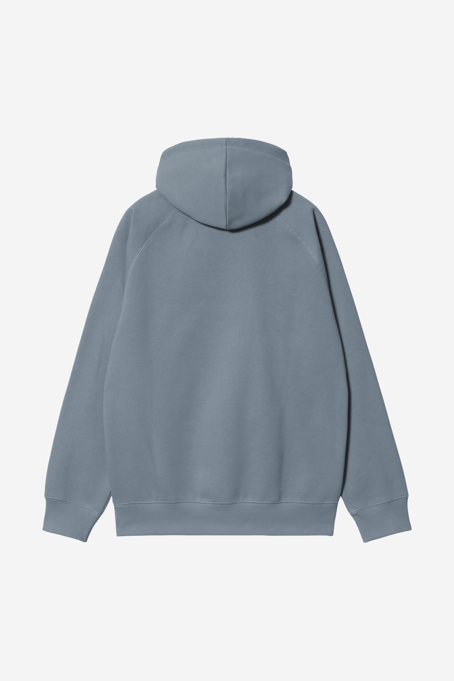 The Hooded Chase Sweatshirt from Carhartt WIP is constructed from heavyweight polycotton fabric in a regular fit. The fabric has also been brushed, giving it a fleece-like backing. The item features raglan sleeves and is detailed with flatlock stitching. An embroidered 'C' Logo appears on the left sleeve.