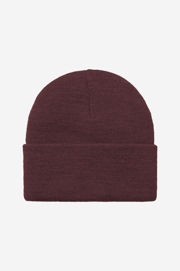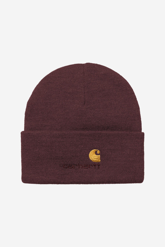 The American Script Beanie is a stretch-knit style made from recycled polyester fibers. An embroidered, two-tone American Script logo appears on the cuffs.