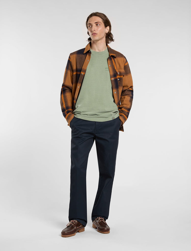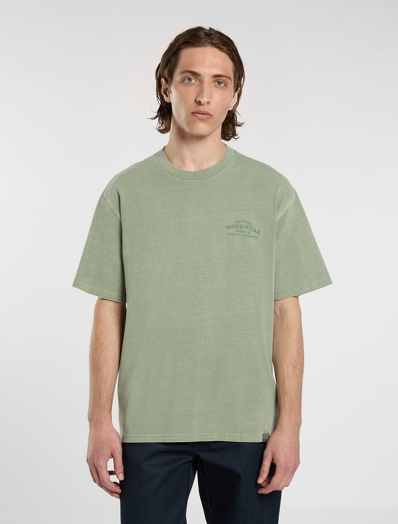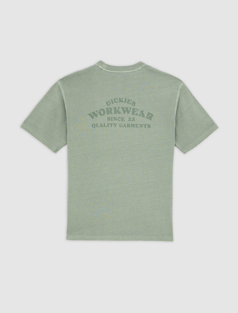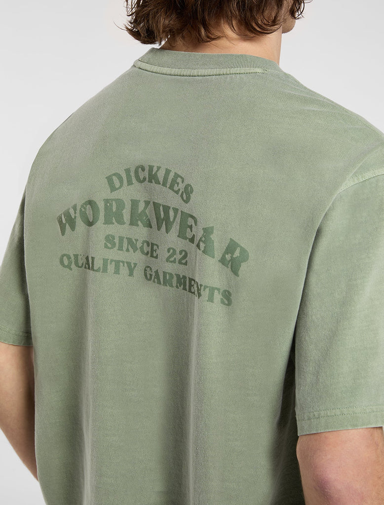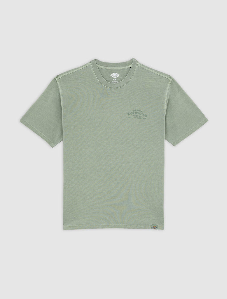 The Christiana mid weight garment dye t-shirt from Dickies is a comfortable, everyday short sleeve t-shirt with authentic Dickies detailing and fabrication. It has a unique garment dyed finish alongside vintage-inspired signage artwork on the front and back.