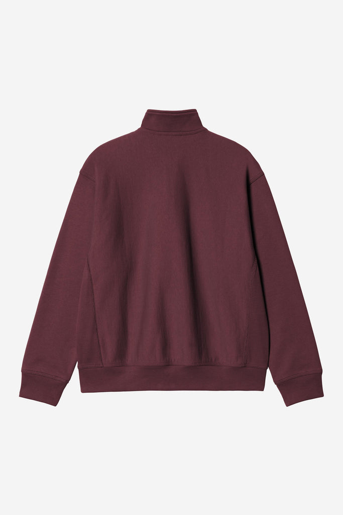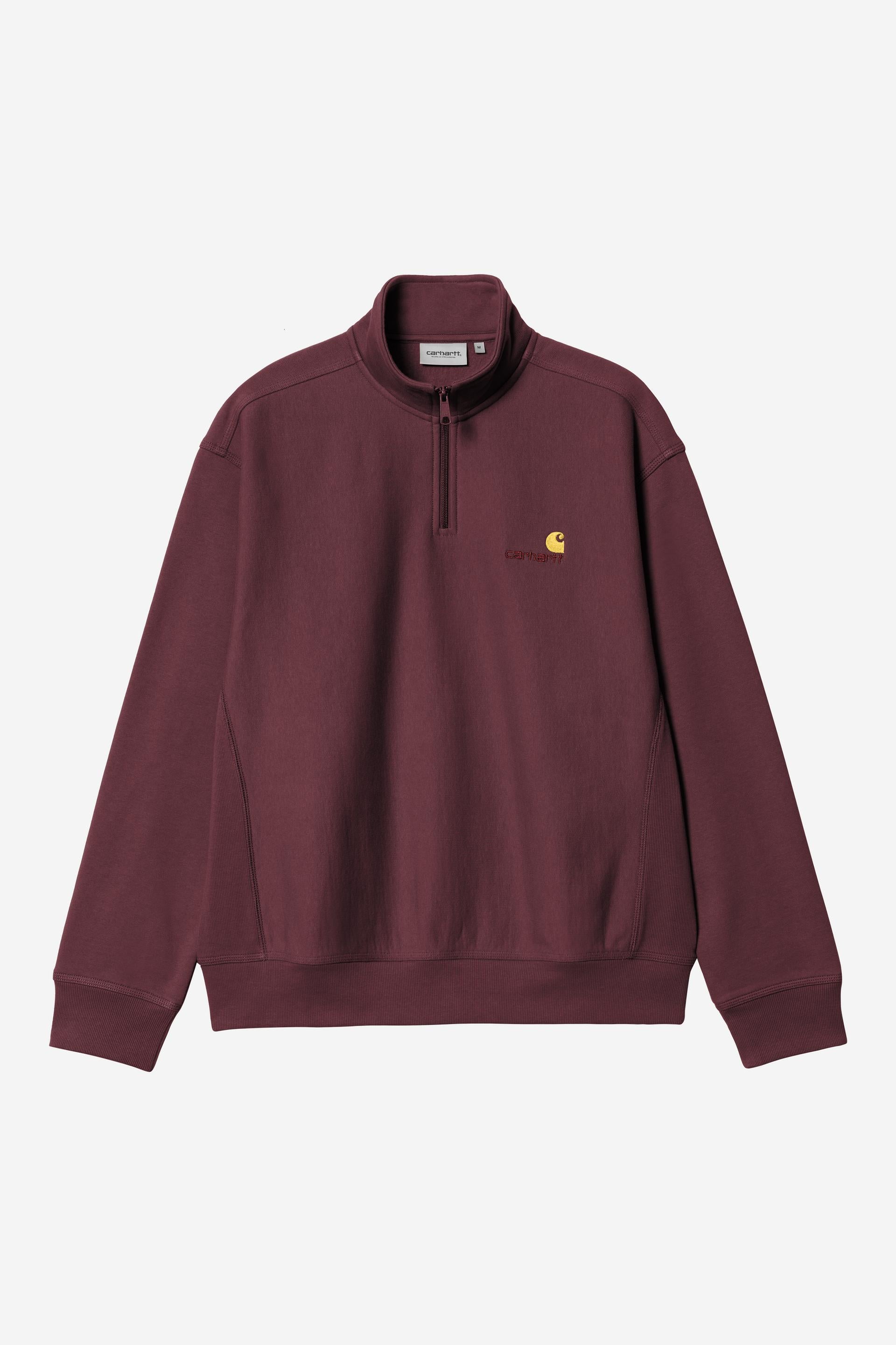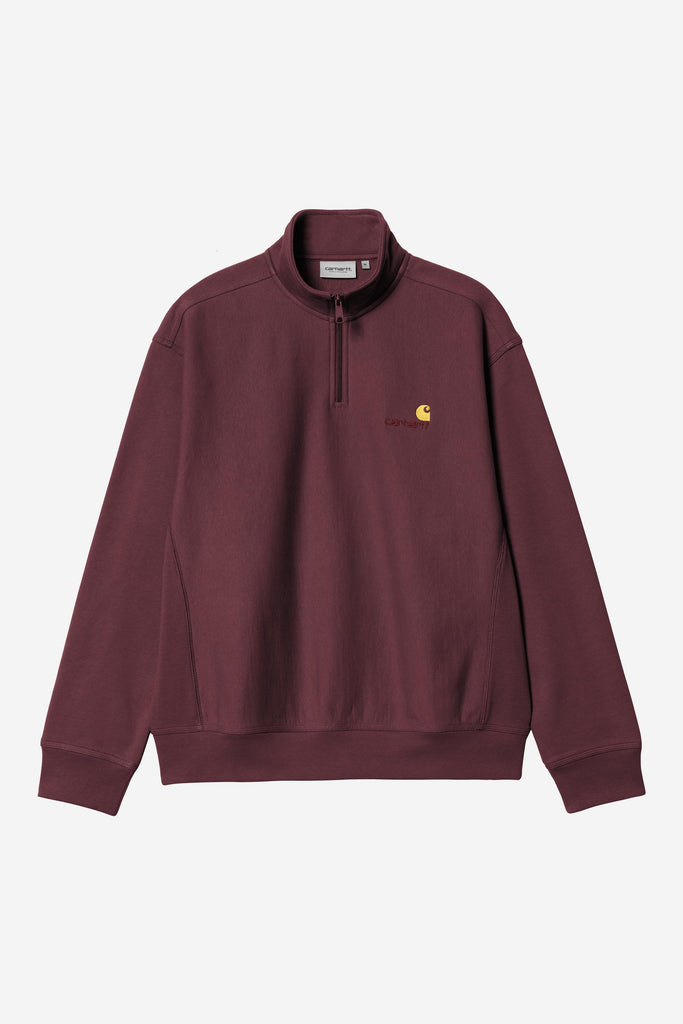 The Carhartt WIP Half Zip American Script Sweatshirt is constructed from a 12.3 oz cotton-polyester blend and brushed for extra softness and warmth, without losing breathability. The garment features a highneck with a zipper and a small logo. Appears in a loose, boxy silhouette.