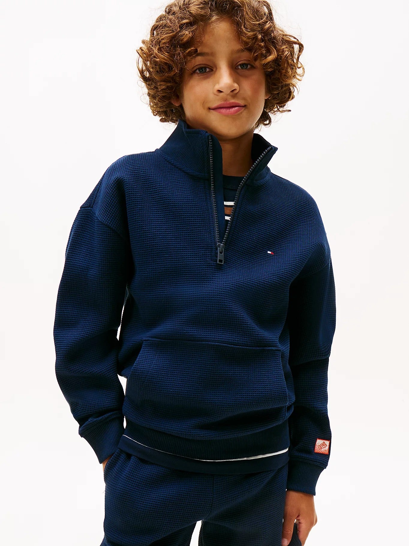 Great for layering, this pure Tommy Hilfiger cotton jumper is designed in a waffle knit with a handy kangaroo pocket and sporty half-zip fastening.